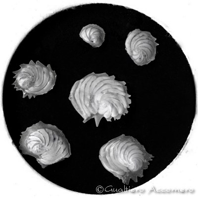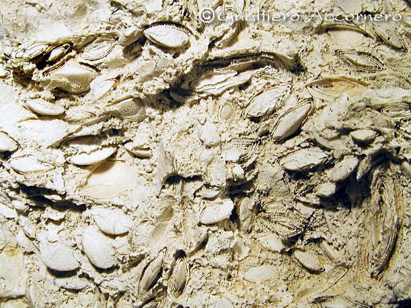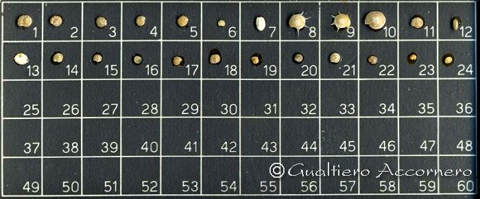Serie di vari esemplari di microfossili rivenuti in sabbia marina del Pliocene della zona di Santo Stefano Roero (CN), si tratta di esemplari tratti da una quantità di sabbia pari a meno di mezzo bicchiere. Gli esemplari sono stati incollati con un colla speciala (in questo caso scaglie di gommalacca disciolta in alcool) nei rispettivi alloggiamenti. Nella foto sotto: ingrandimento.