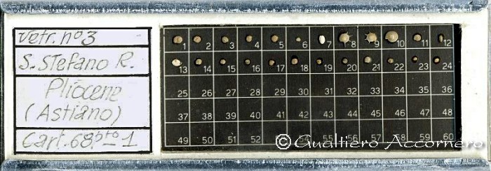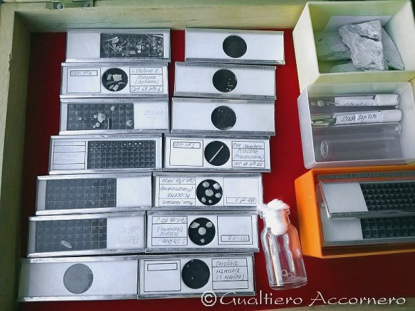Per microfossili di non piccolissime dimensioni esistono vetrini con alloggiamenti particolari. Nelle fotografie si possono vedere dei vetrini con scomparti numerati, da 5mm di lato, destinati ad esemplari con dimensioni massime di questo valore. Questo lavoro di collocazione implica una grande impegno e molta pazienza: anche un leggero "soffio" può far volar via un esemplare pertanto si lavora indossando una mascherina.