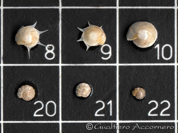 Serie alcuni esemplari di foraminiferi del vetrino di cui sopra, rivenuti in sabbia marina del Pliocene della zona di Santo Stefano Roero (CN). N° 8 e 9: Lenticulina calcar; n° 10: Lenticulina orbicularis e n° 20, 21 e 22: Gyroidina lamarckiana