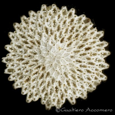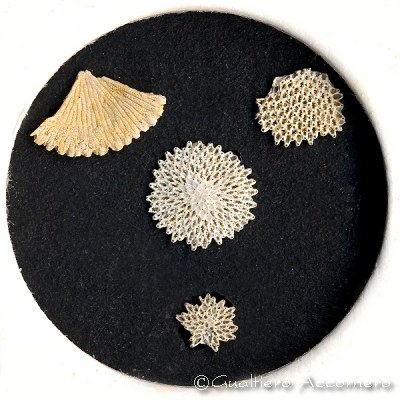 Serie alcuni esemplari di Briozoi rivenuti in sabbia marina del Pliocene della zona di Santo Stefano Roero (CN). I briozoi sono Invertebrati marini, simili ai Cnidari (coralli) che vivono in colonie dall'aspetto arborescente, spesso di piccole dimensioni, sono oggetto di studio della Micropaleontologia. Nella foto di destra ho ingrandito la bella forma della piccola colonia (diametro di 5 mm).