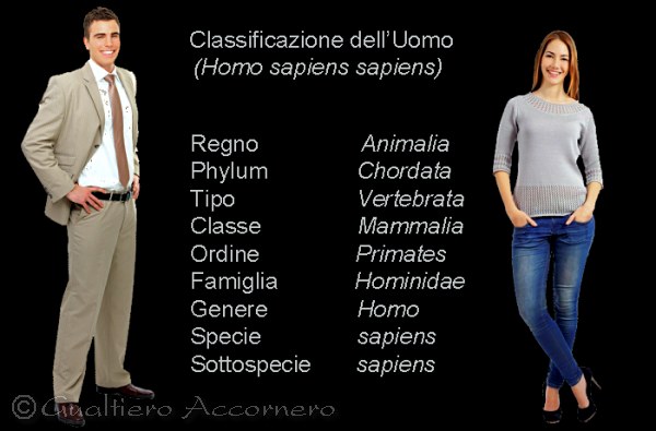 Un esempio embelmatico di classificazione tassonomica e quello della specie a cui noi apparteniamo. In altro appaiono i simboli del genere maschile e feammile. Noi apparteniamo alla sottospecie ancora vivente classificata sapiens. L'altra sottospecie umana, che si è estinta, è la neaderthalensis, cioè l'uomo di Neandertal. Anche nella specie umana, come in moltissimi organismi, esiste un dimorfismo sessuale, nel nostro caso non molto accentuato, dove il genere femmnile risulta di statura leggermente inferiore a quello maschile. |