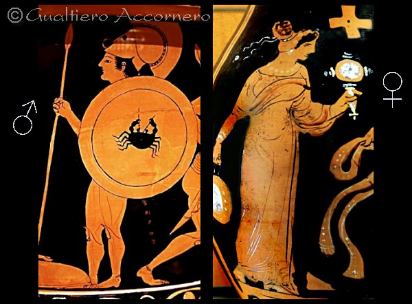 Su due antichi vasi greci notiamo da dove deriva il simbolo maschile e femminile: lo scudo e lancia del guerriero e lo specchio di forma particolare usato dalla fanciulla. |