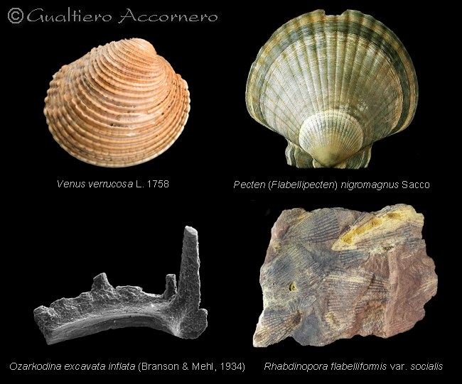 A livello divulgativo bastano i nomi generico e specifico: Venus verrucosa e Pecten (Flabellipecten) nigromagnus sono dei Bivalvi del Pliocene piemontese, Ozarkodina excavata inflata è un Conodonte del Devoniano dell'Ungheria, Rhabdinopora flabelliformis var. socialis è un Graptolite dell'Ordoviciano della Russia (gli esemplari non sono in scala tra loro). |