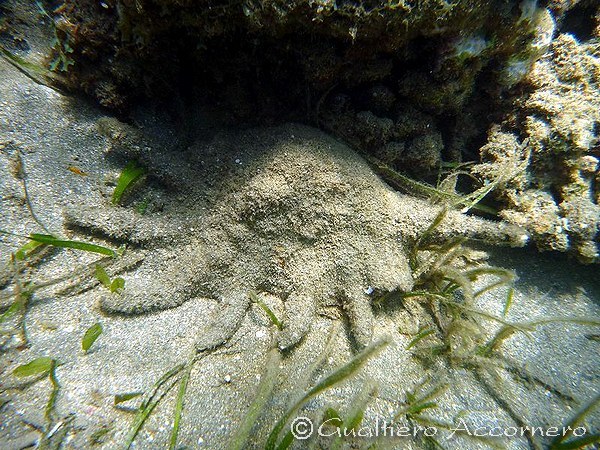 Note - Mollusco appartenente alla classe dei Cefalopodi. Sono gli organismi più "evoliti" del phylum degli Invertebrati. Questo esemplare di grandi dimensioni osserva la fotocamera ed inizia a raggrizire la pelle, inquieto, pronto a mimetizzarsi o fuggire.