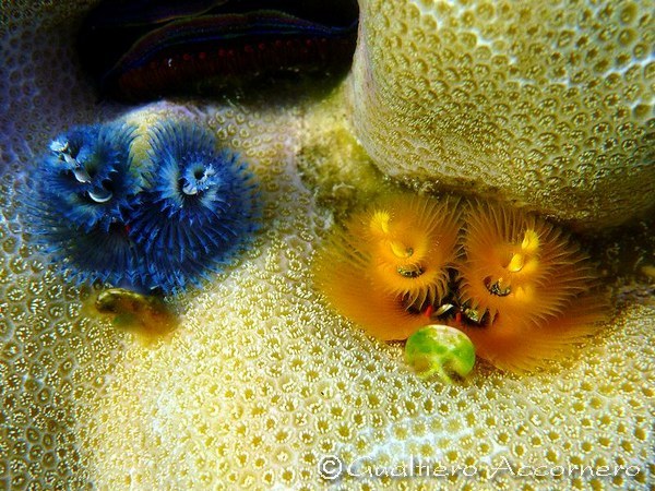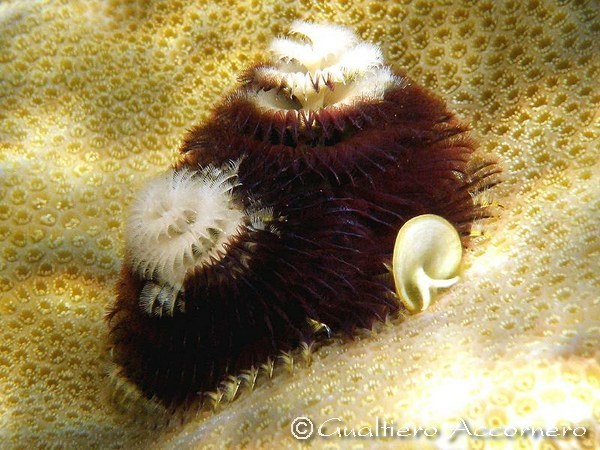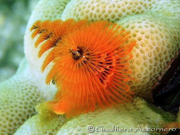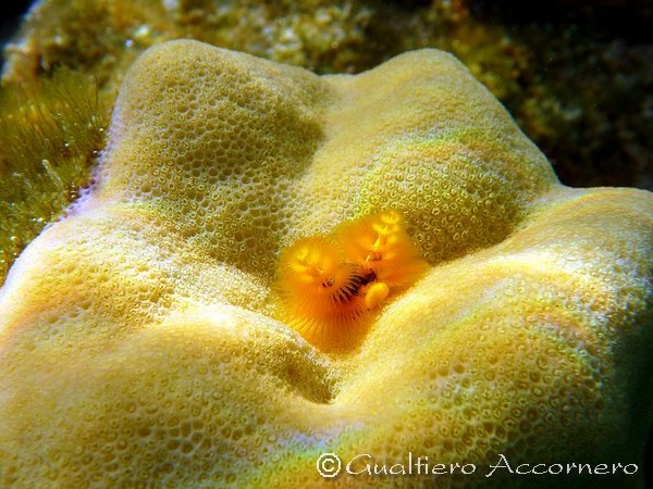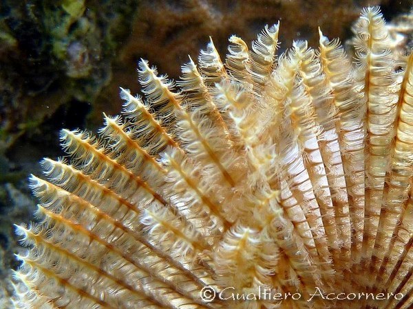 Note - Un bellissimo Invertebrato appartenente al phylum degli Anellidi, vermi Policheti, famiglia dei Sabellidi. Sono filtratori marini sessili che portano un anello di tentacoli di alimentazione di forma piumata. Non lasciamoci ingannare dalla sua bellezza:se si riesce a toccarlo (si ritrae in modo velocissimo nel suo tubo di consistenza cartacea) rilascia pei piccoli uncini che penetrano nella pelle e sono difficili da estrarre.