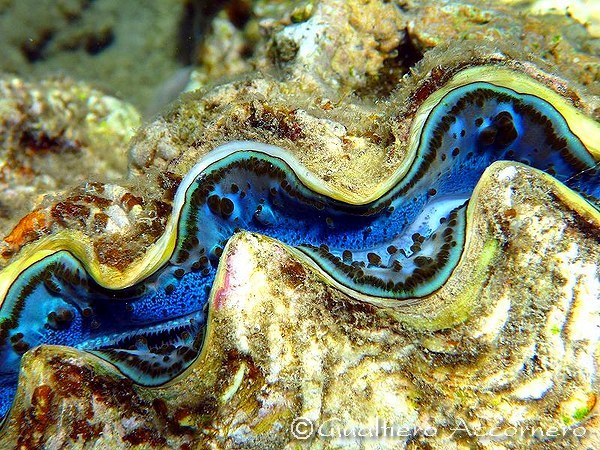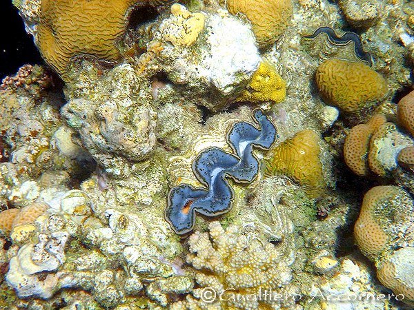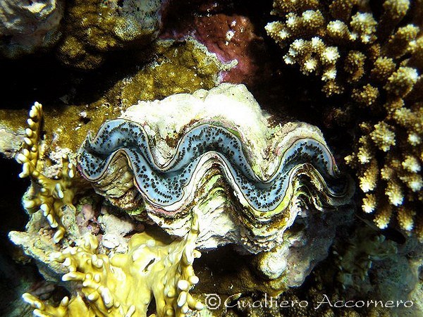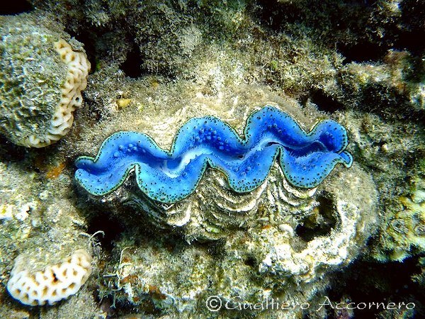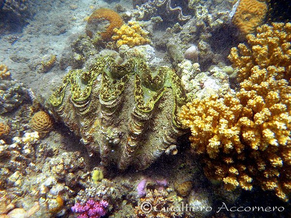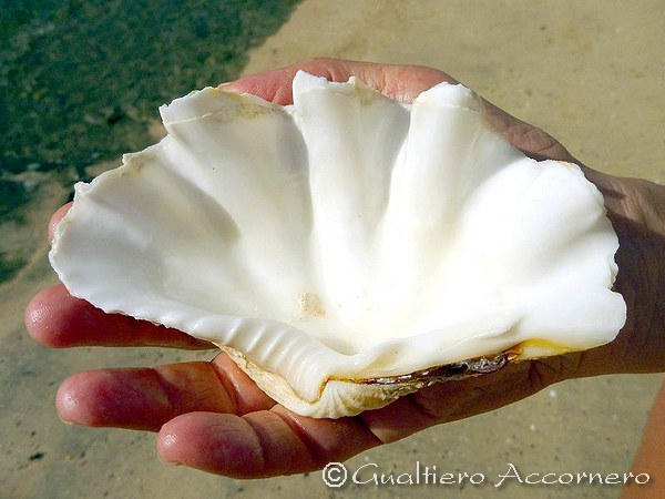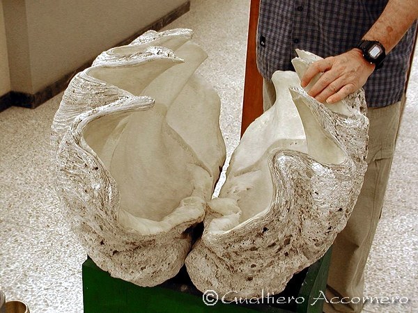 Note - la Tridacna gigante in assoluto è il Bivalve (famiglia Cardiidae, tipica dell'Oceano Pacifico occidentale) che presenta la conchiglia più grande esistente al mondo. Nella prima foto mia moglie nel lontano 1988 serve come rifrerimento per le dimensione di queto "piccolo esemplare" che giaceva presso la spiaggia. Nella seconda compare un esemplare di 125 chilogrammi conservato nel Museo di Storia Naturale Don Bosco di Valsalice, di Torino, con cui collaboro.