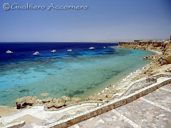 Assalto al reef (Ras Umm Sid, Sharm el-Sheikh, Egitto, luglio 2000). L'area molto bella ed ambita per le immersioni con bombole è chiamata "Temple". Si possono contare otto battelli adibiti al trasporto di sub che portano una decina di persone per ognuno e possiamo quindi arguire che circa 80 persone dotate di bombole in questo momento stanno potenzialmente aggirandosi per il reef ! |