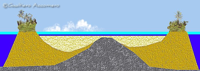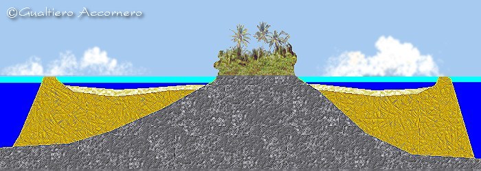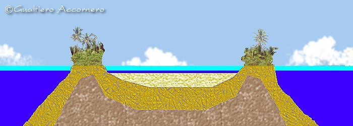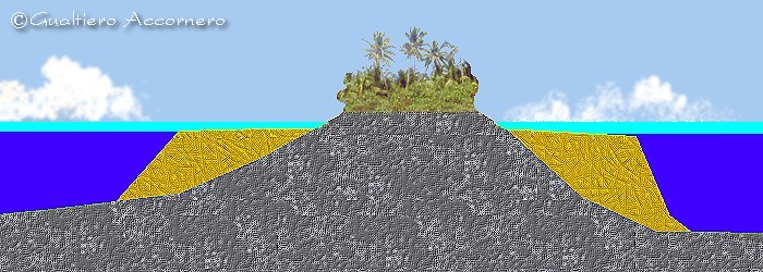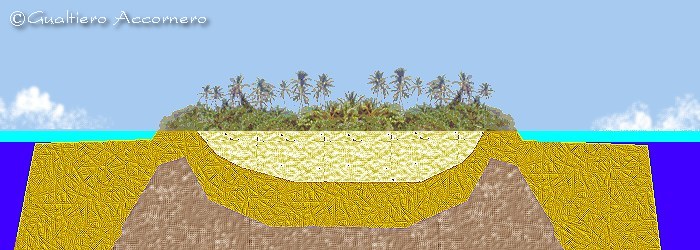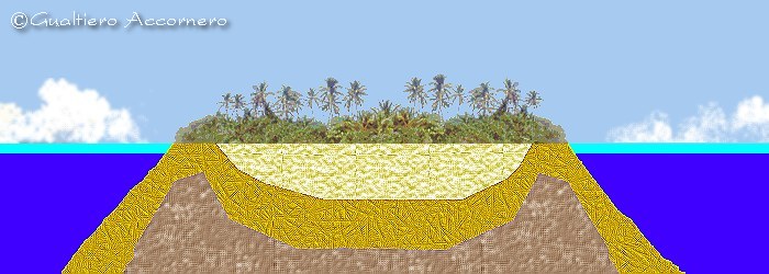 Sotto ho riportato una serie di sezioni geologiche schematiche che illustrano la formazione di un atollo di tipo vulcanico e la sua trasformazione successiva in una vera e propria isola.