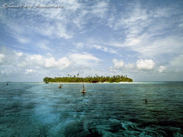 Un'isoletta originatasi da un'atollo. Hembadoo Island, Maldive (marzo 1988). In questo caso la laguna interna si è parzialmente colmata di sedimenti a formare un'isoletta su cui attecchisce la vegetazione: un paradiso tropicale. |