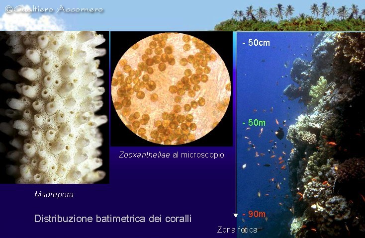 Distribuzione batimetrica dei coralli Crescita del corallo verso la luce giustificato dalla presenza delle Zooxantelle: i polipi possono vivere fino ad una profondità di a circa 90 metri, cioè alla fine della "zona fotica", dove la luce riesce ancora ad giungere. |