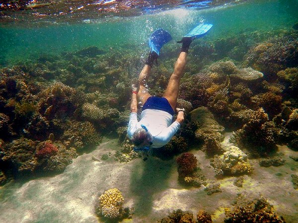 Varietà di forme di vita Già a pochi metri dalla riva, nella zona della laguna interna della barrier reef, si incontra un mondo fantastico e colorato che testimonia la presenza di molteplici forme di vita. Nella foto lo scrivente si immerge tra le madrepore del parco marino del Wadi El Gemal, Egitto (foto Dario Alberton). |