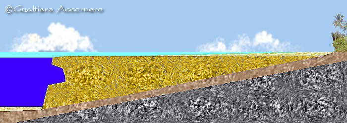 Nella sezione geologica schematica semplificata riportata sotto, ho disegnato la morfologia teorica in cui compare la costa orlata dal fringing reef. Dato che si presuppone che il livello marino non subisca variazioni il corallo si accresce orizzontalmente sviluppandosi verso il largo. La scogliera madreporica pertanto si mantiene sotto il pelo dell'acqua (livello compreso tra la bassa ed alta marea) ed ha la sola possibilità di accrescersi verso il mare aperto.