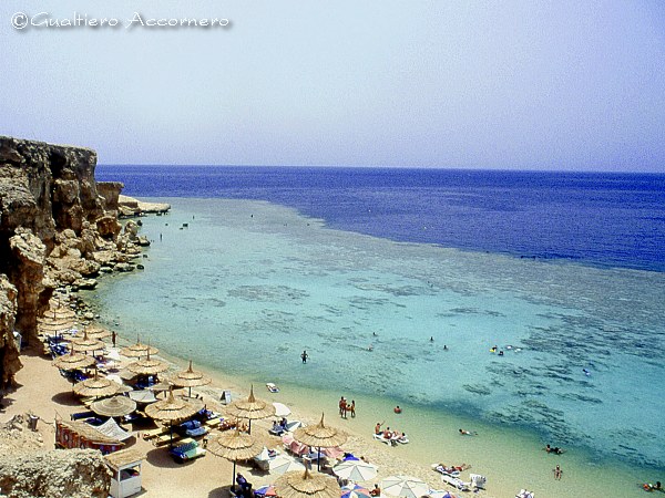 Piattaforma corallina del fringing reef. Ras Umm Sid (Sharm el-Sheikh, Egitto, luglio 2000). Il fringing reef si protrae verso il mare creando così una piccola piattaforma corallina interna parzialmente coperta da sedimenti. |