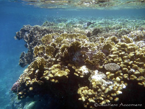 Il fringing reef termina in mare aperto. Parco naturale di Wadi el Gemal, Egitto. La piattaforma corallina si protrae verso il largo e termina cin un "gradino" in mare aperto: questa zona è particolarmente ricca di biodiversità. |